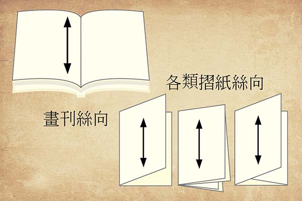 摺紙時,絲向方向與摺線平行,摺邊才會平順,易造成摺線精確度會變差容易產生浪邊;對摺處若印刷油墨太多,易造成墨膜破裂、裝訂時絲流方向與裝訂邊平行,書刊較利於翻閱,膠裝時亦較不易變形。