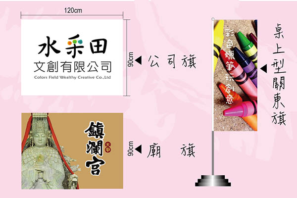 旗幟是萬年不敗的廣告利器,不但能營造氣勢,提高行人注目度,更能將廣告訊息延伸至店外,幫您把客戶拉進門, 常用於展覽會場、商店門口、各種造勢活動、舞台佈置等,為廣告必備利器之一。